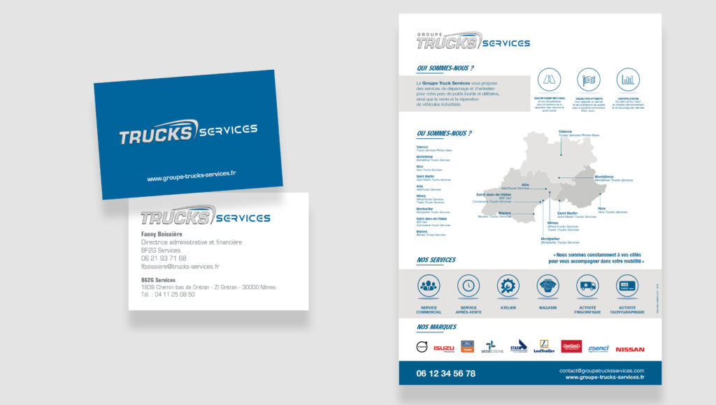Pour le Groupe Trucks Services, réseau de garages et ateliers spécialisés dans l’entretien et la réparation de camions poids lourds en Occitanie, PACA et Auvergne-Rhône-Alpes, nous avons conçu une identité visuelle moderne et épurée, reflétant solidité, fiabilité et réactivité.
