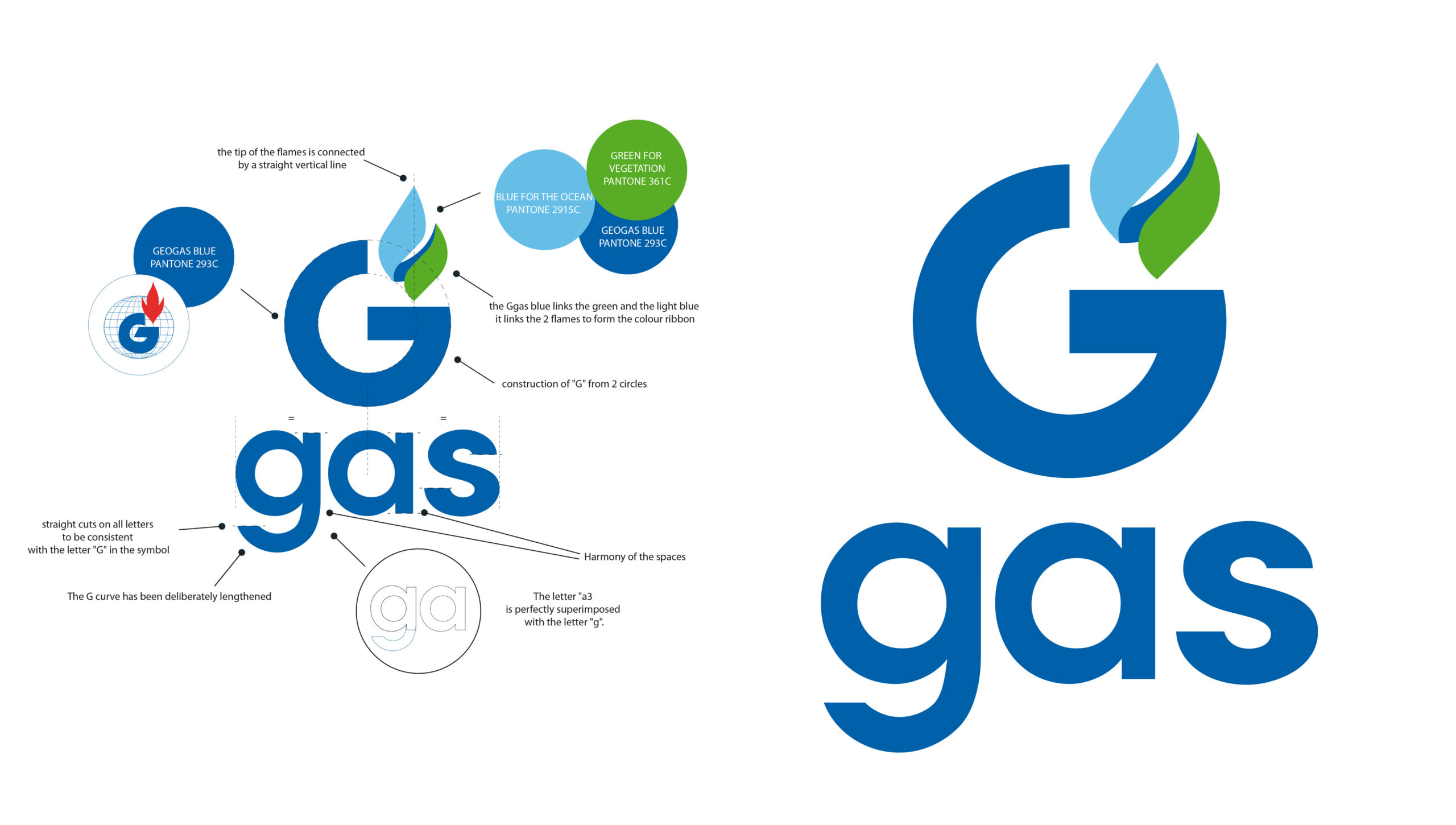 Conception du logo et identité visuelle moderne avec flamme stylisée, couleurs bleues inspirant confiance et visibilité dans le secteur gaz.