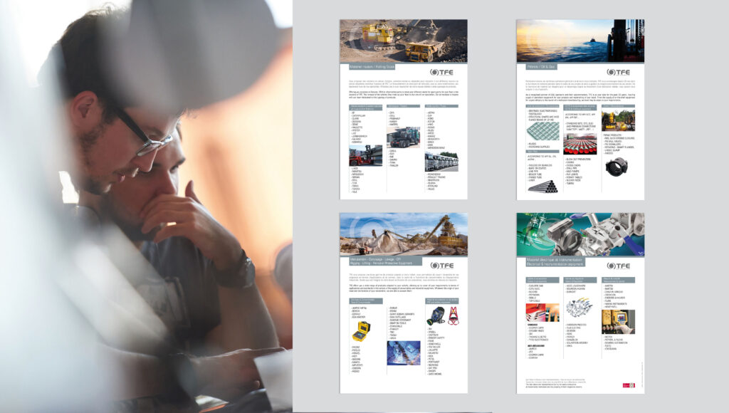 Nous avons également conçu des supports de communication multilingues adaptés aux marchés globaux : plaquette commerciale avec fiches techniques modulables, chemise de présentation professionnelle, et annonces presse dans des revues spécialisées.